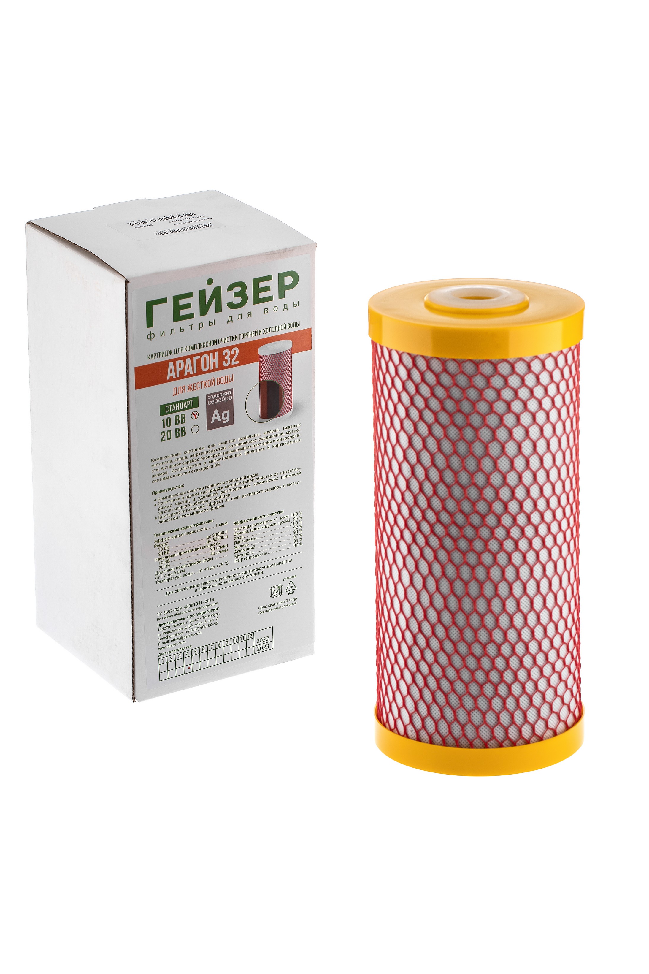 Композитный картридж Арагон 32 ВВ10 предназначен для очистки жесткой воды от ржавчины, железа, тяжелых металлов, хлора, нефтепродуктов, органических соединений и мутности. Активное серебро в блокирует размножение бактерий и микроорганизмов. Используется в фильтрах Гейзер Тайфун, магистральных фильтрах и картриджных системах очистки стандарта ВВ.