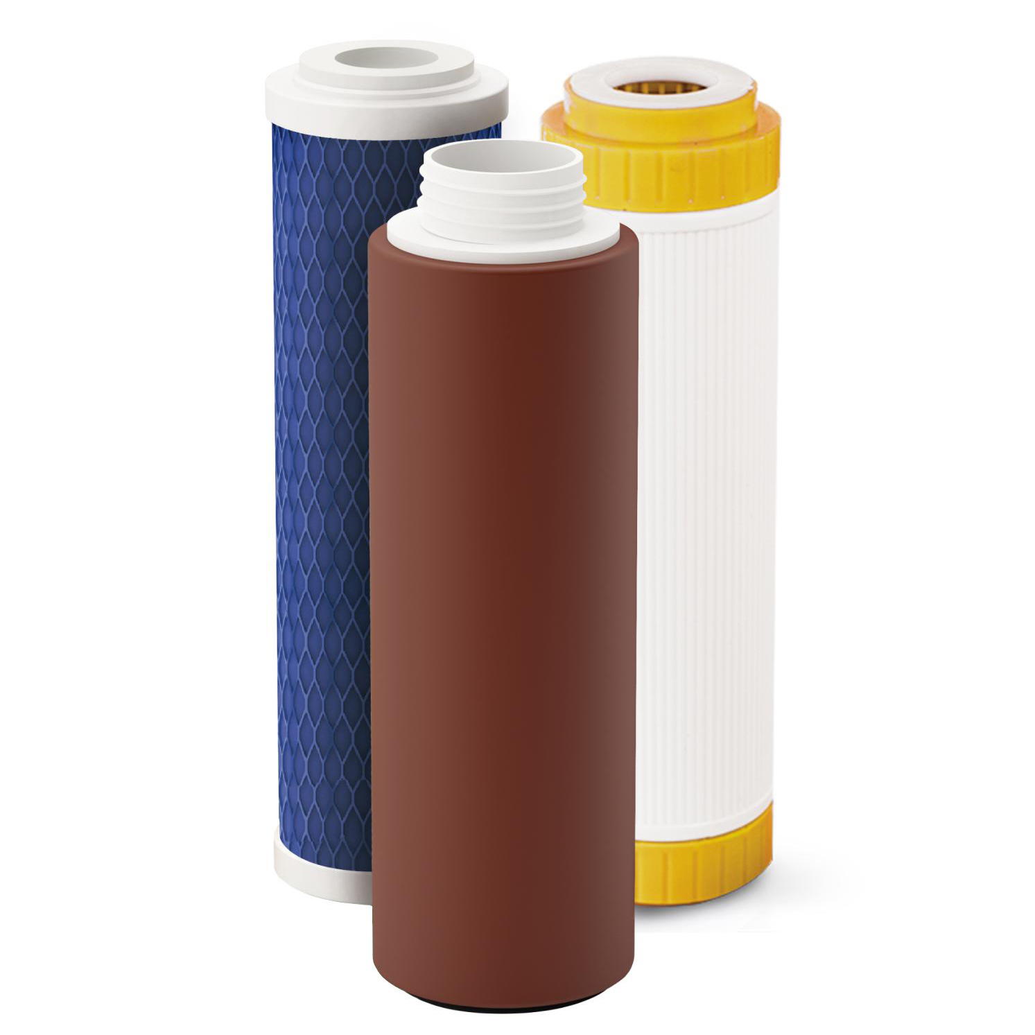 Комплект сменных картриджей для комплексной очистки, удаления солей жесткости и обеззараживания воды. Подходит к фильтрам Гейзер серии БИО.