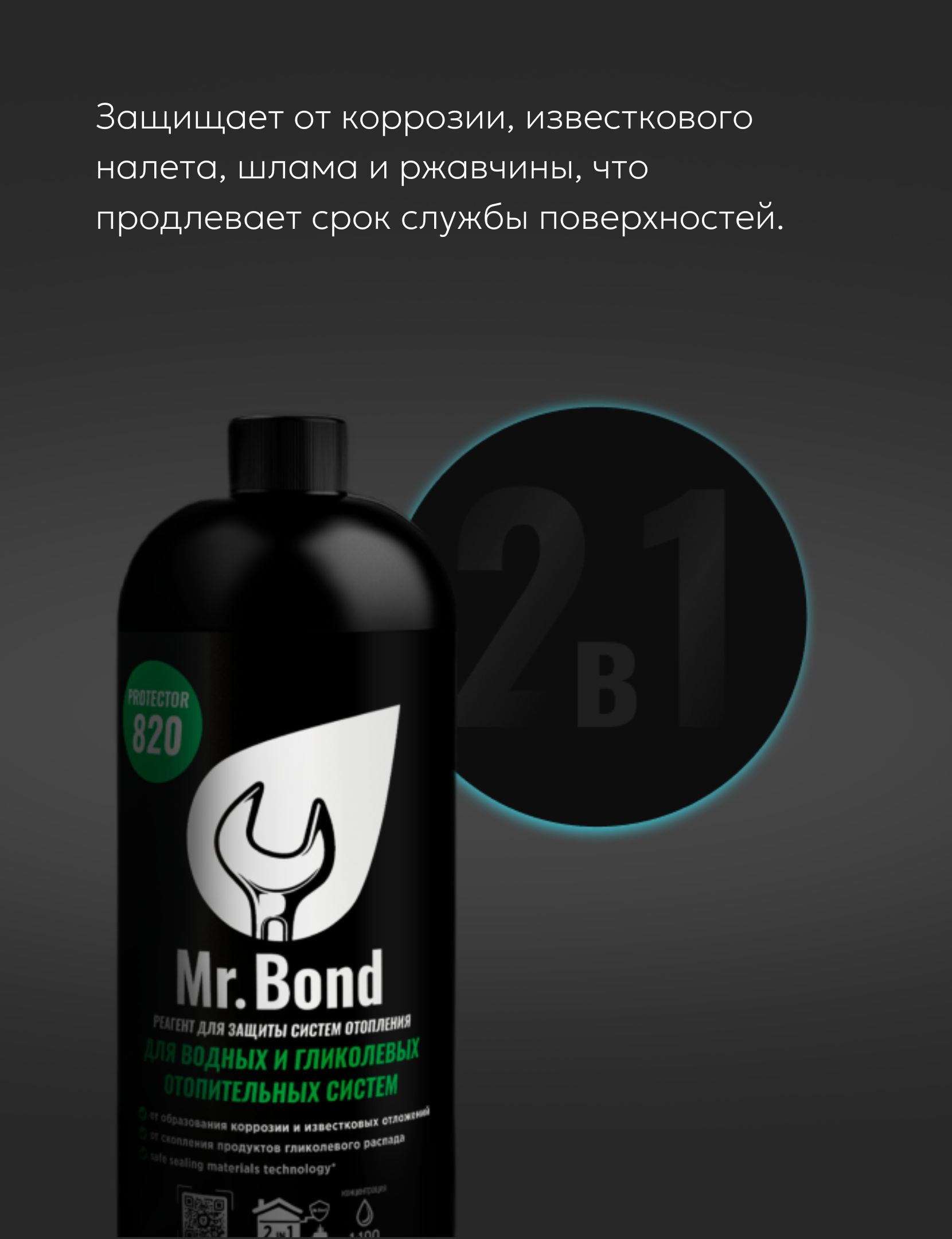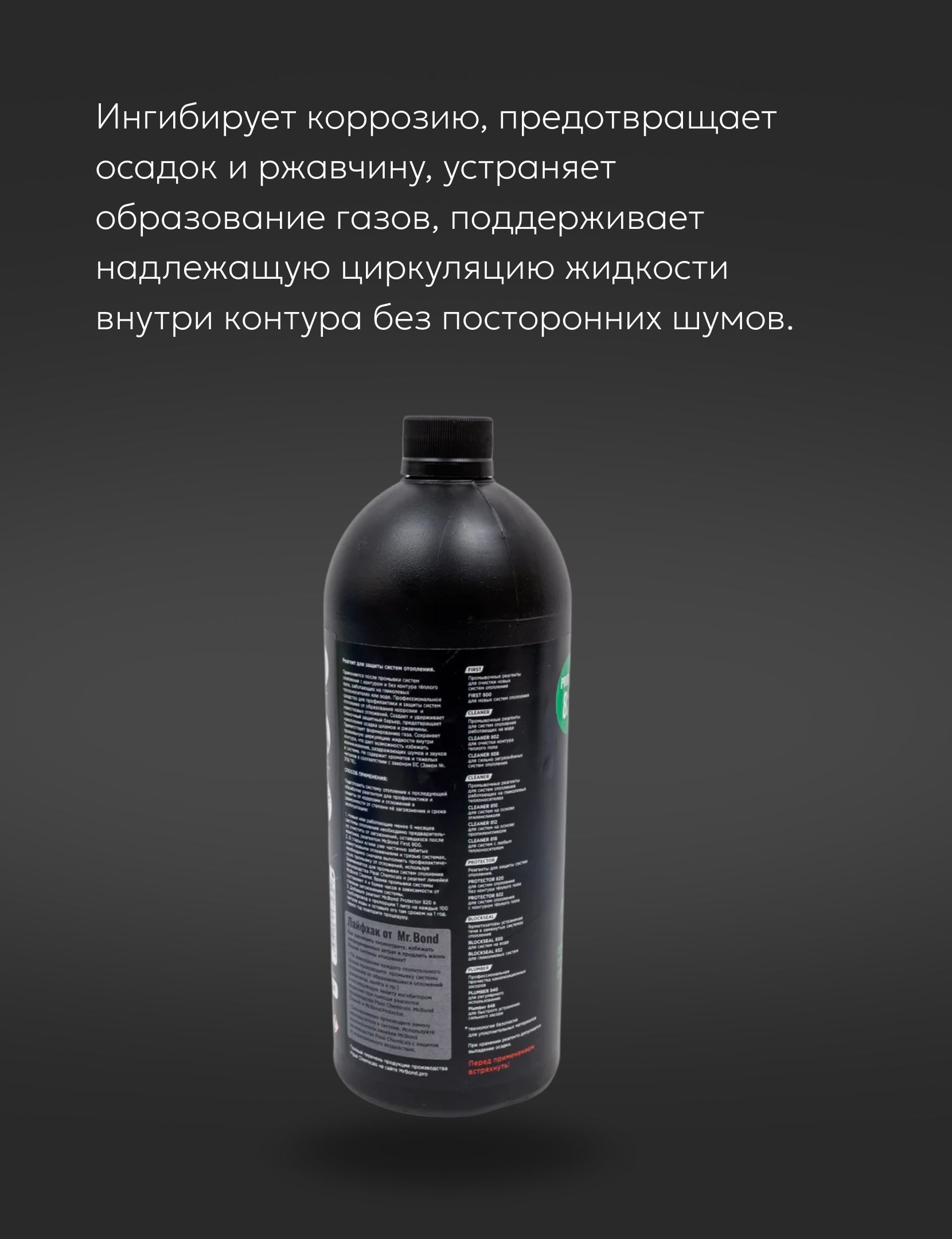 Реагент 820 Mr.Bond 2 в1 для защиты отопления от коррозии, известкового налета, шлама и ржавчины, 1 литр