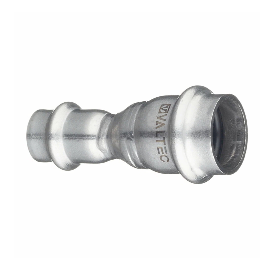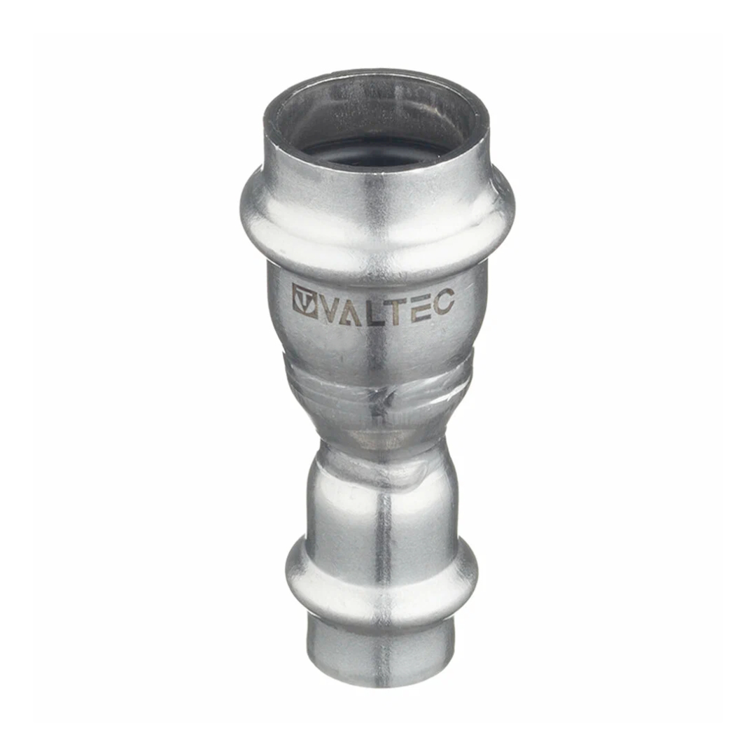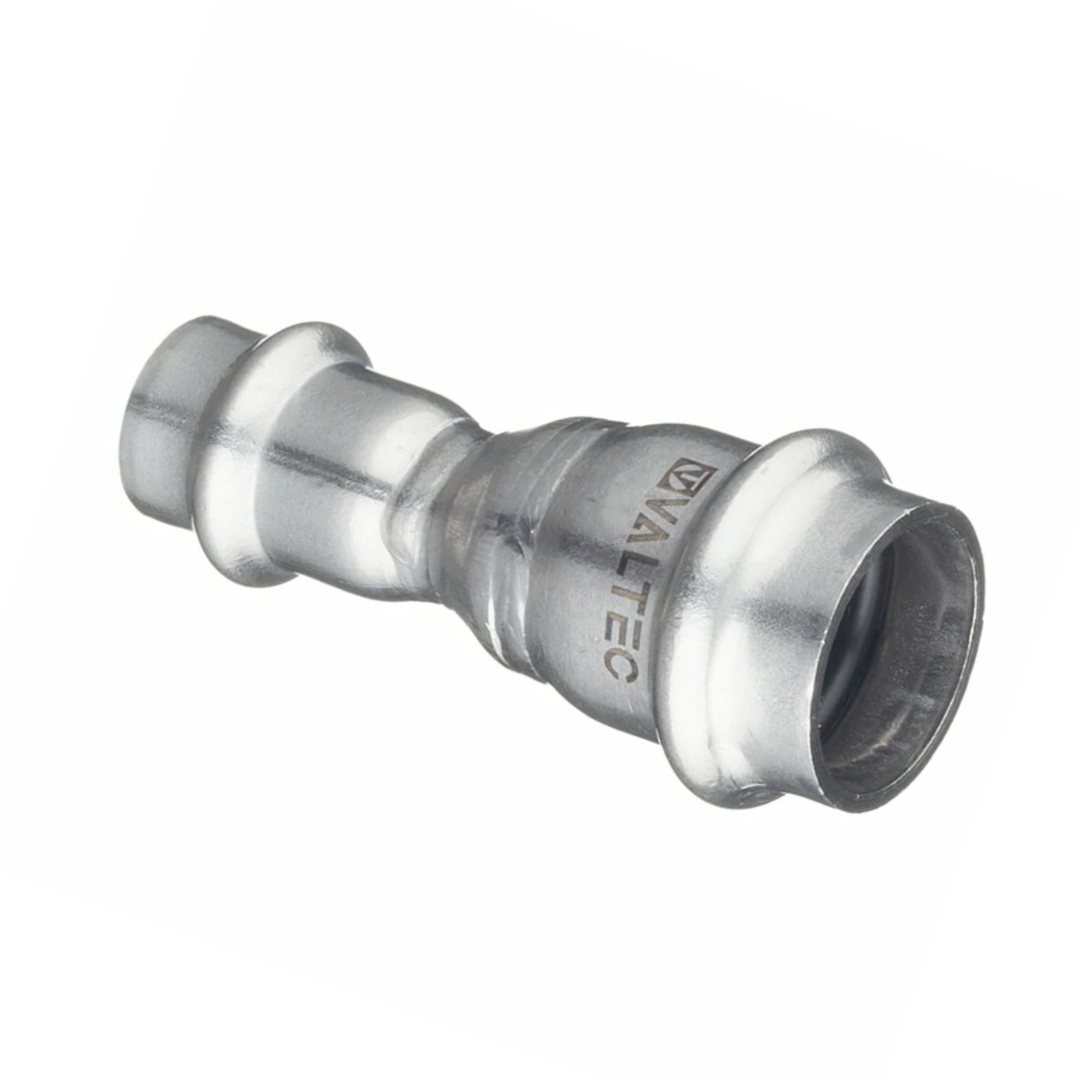 Муфта VTi.903.l изготовлена из стали AISI 304. Материал уплотнительных колец – эластомер EPDM. Отдельно можно приобрести уплотнительные кольца из FPM (витон); в этом случае максимальная рабочая температура увеличивается до 140 °С. Достоинством бесштуцерных соединителей является малый коэффициент местного сопротивления (сужение канала практически отсутствует). Фитинг рассчитан на обжатие с помощью пресс-инструмента V-профиля.