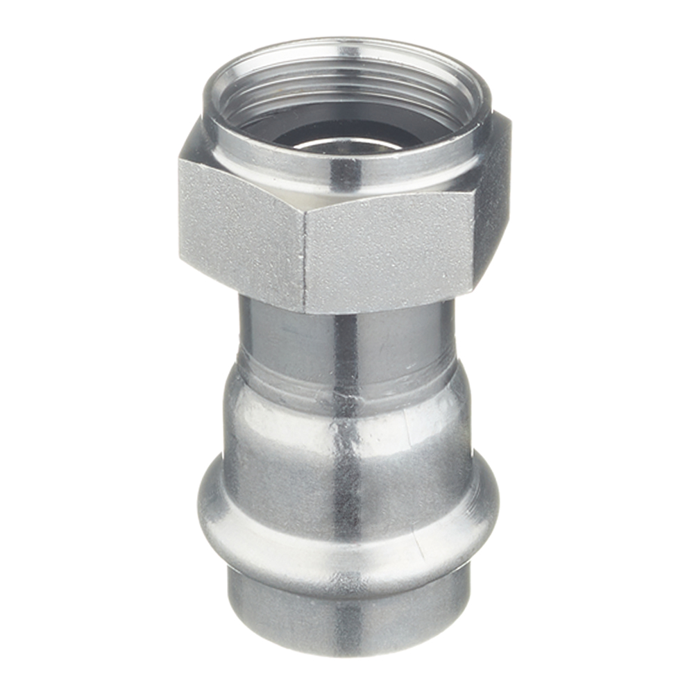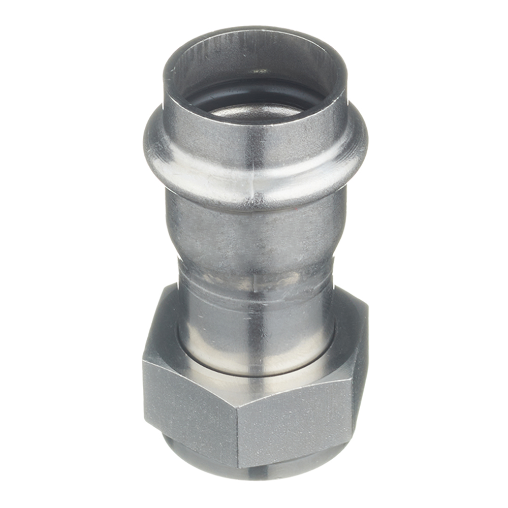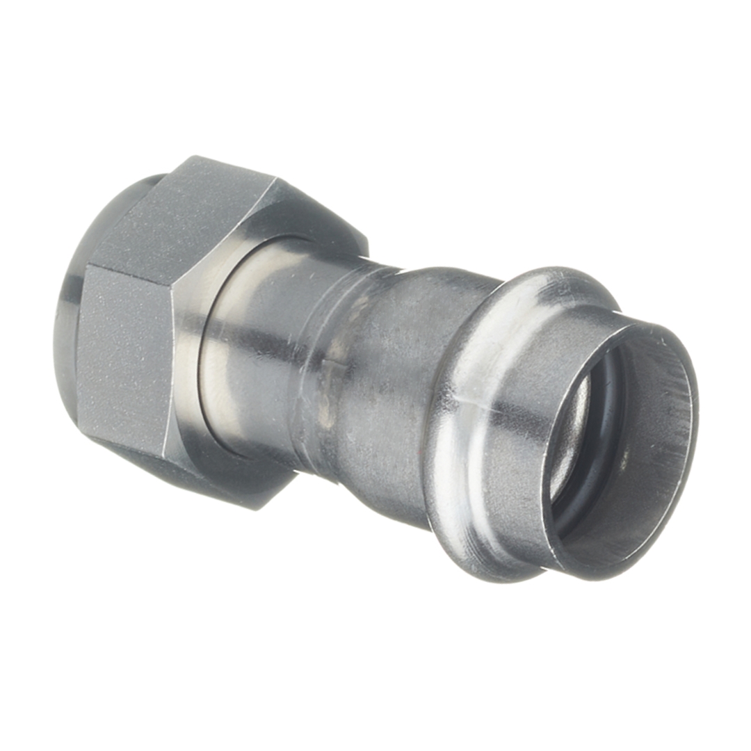 Пресс-фитинг из нержавеющей стали с накидной гайкой обеспечивает соединение тонкостенной стальной трубы номенклатуры VT.INOX-PRESS c элементом системы, имеющим наружную резьбу. Область применения – трубопроводы водоснабжения, отопления, иные инженерные и технологические установки с рабочей температурой до 120 °С и давлением до 16 бар.