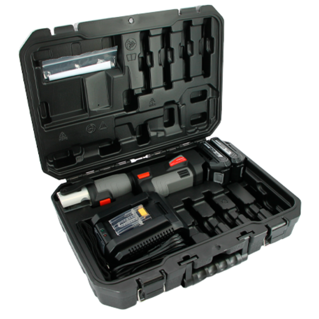 В комплект поставки входит инструмент радиальный аккумуляторный, два сменных аккумулятора, зарядное устройство и кейс.