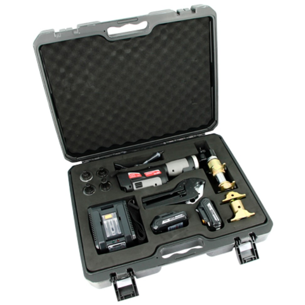 В комплект поставки входит аксиальный инструмент с расширителем и экспандером, расширительные насадки (мм) 16 х 2.2, 20 х 2.8, 25 х 3.5, 32 х 4.4, пресс-клещи (мм) 16-20, 25-32, труборезные ножницы, зарядное устройство, Li-ion аккумулятор 18В, 2,0 А*ч (2 шт) и кейс.