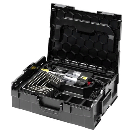 приспособление для сверления, сверлильный вал, приспособление для позиционирования, пресс-инструмент для врезных соединений, сверлильная коронка, чемодан, места для хранения врезных фитингов Megapress