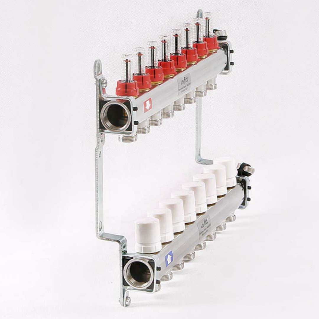 Коллекторные группы Uni-Fitt предназначены для распределения и регулирования потоков теплоносителя в низко- или высокотемпературных системах отопления. Оснащены расходомерами на подающем коллекторе и термостатическими вентилями (с возможностью установки термоэлектрических приводов) на обратном коллекторе. Каждое изделие укомплектовано дренажным клапаном / воздухоотводчиком, который может быть использован для заполнения системы.