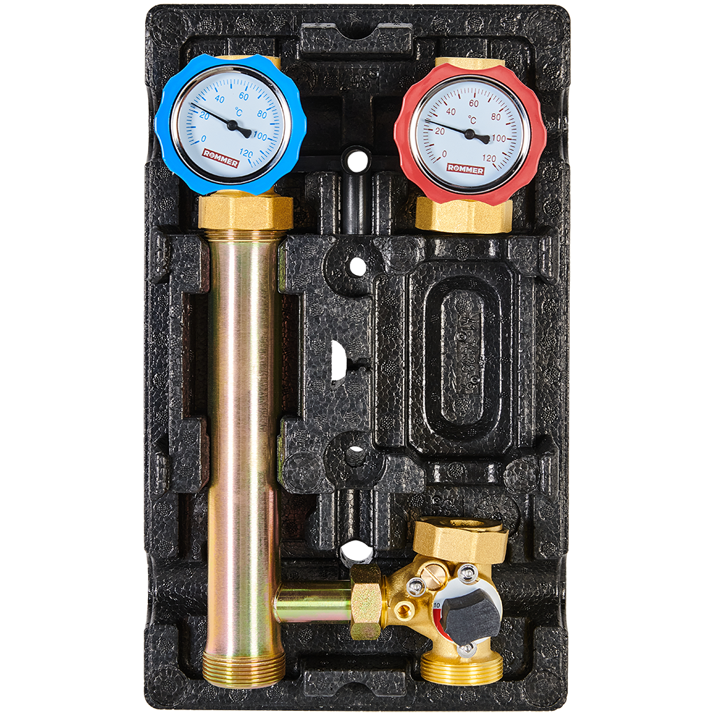Насосная группа ROMMER RDG-1003-002501 без насоса с 3-ходовым приводным смесителем представляет собой набор элементов для обеспечения циркуляции и регулирования температуры теплоносителя в системе радиаторного отопления или “теплого пола”.
