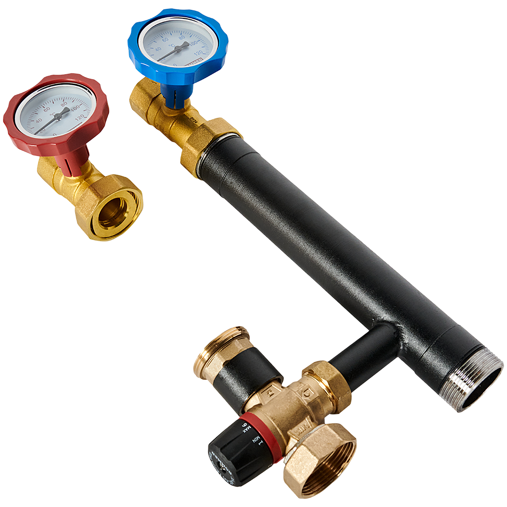 - Термостатический смесительный клапан в линии подачи с накидной гайкой (1" 1/2) для установки насоса;