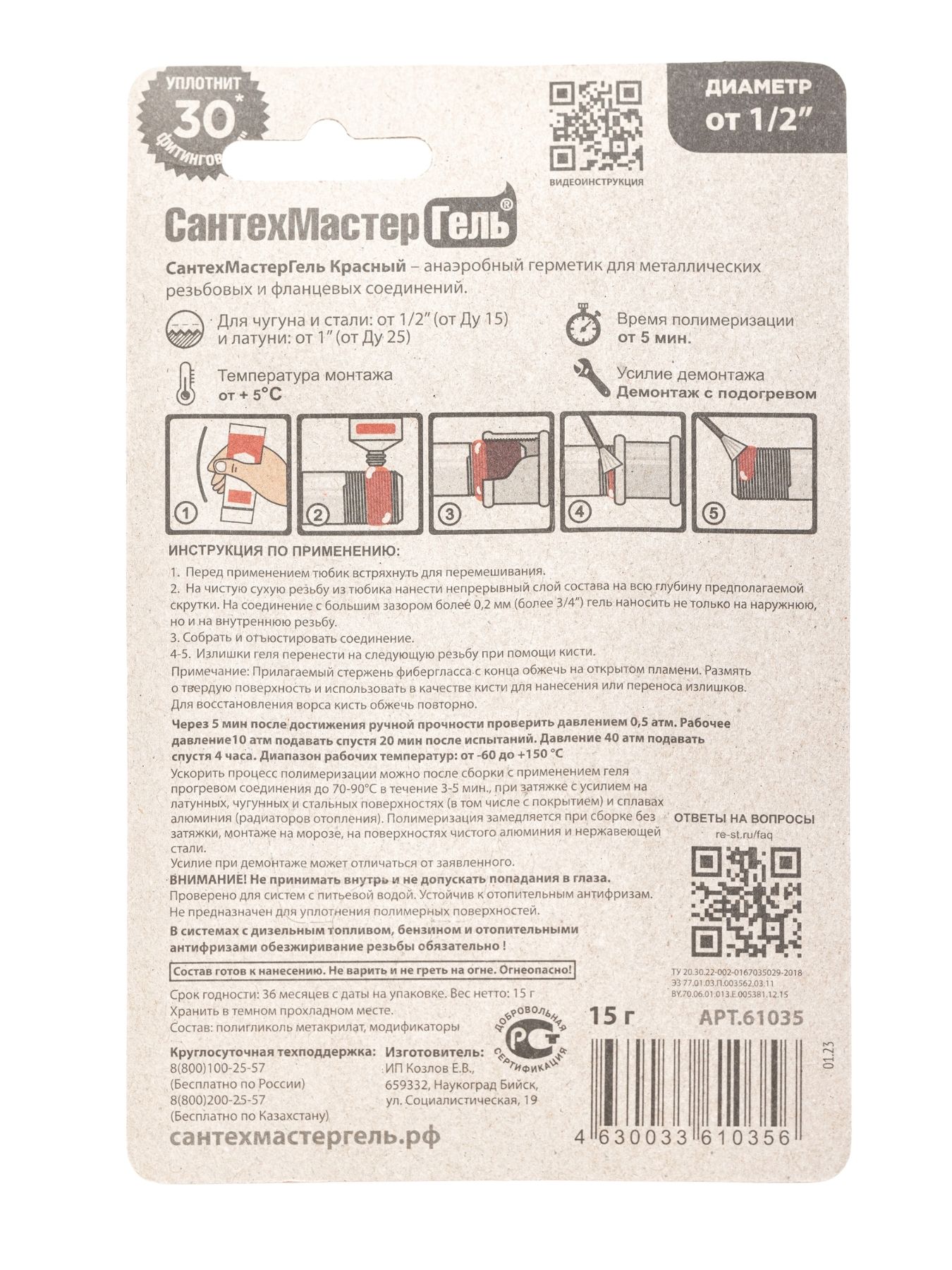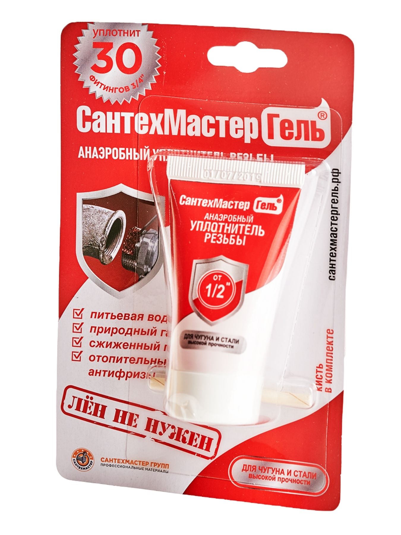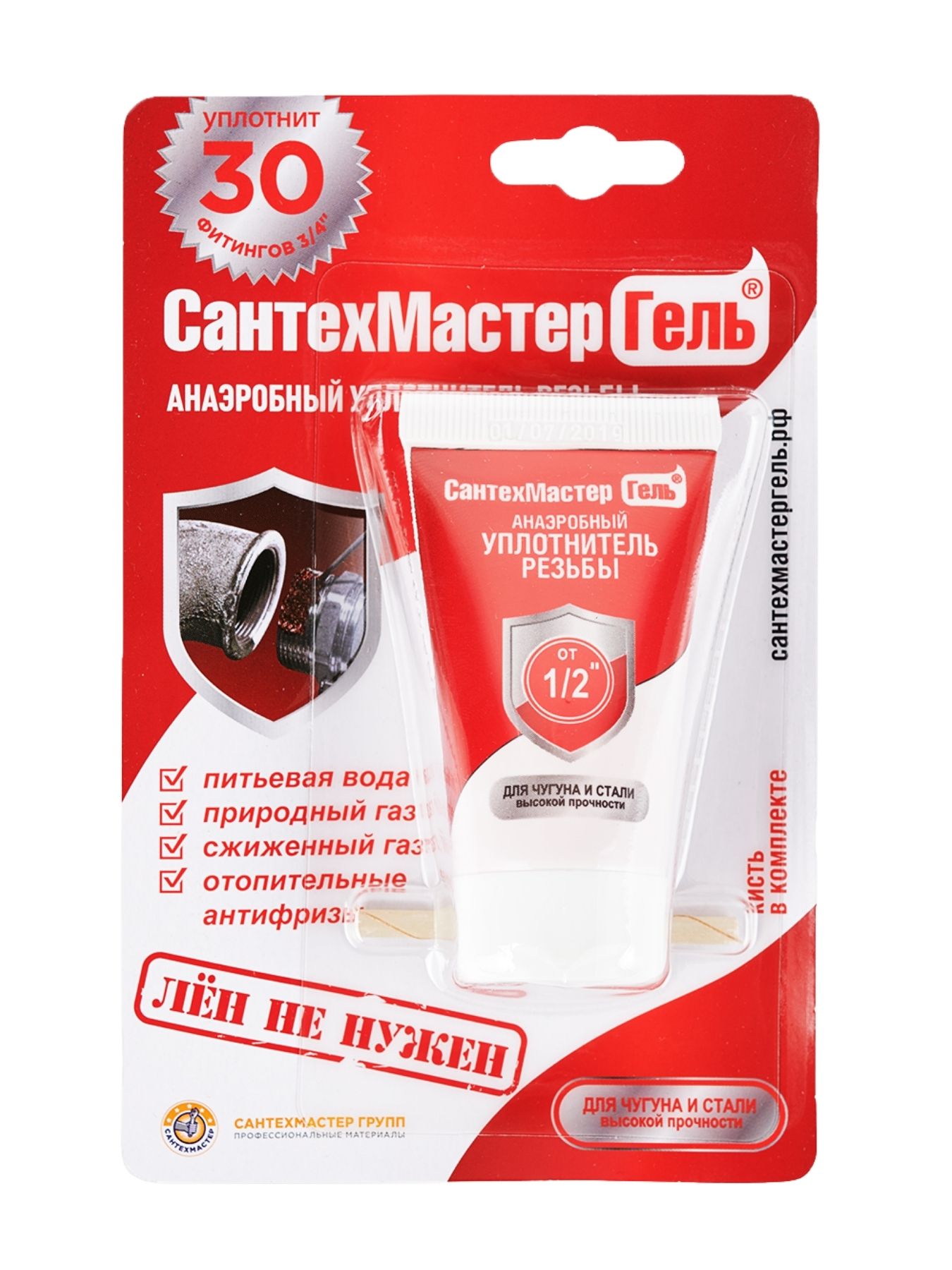 Красный Сантехмастер Гель для чугуна и стали используется для соединения труб диаметром от 1/2 дюймов. Высокая степень фиксации. Герметизация с помощью этого геля-герметика настолько сильная, что при демонтаже соединение приходится подогревать. Состав рекомендуется использовать там, где необходим срочный запуск системы (общее время полимеризации геля начинается от 5 минут) при температуре окружающей среды от + 5 °C. Ближайшие конкуренты позволяют работать со своими анаэробными герметиками при температуре от + 15 °C.