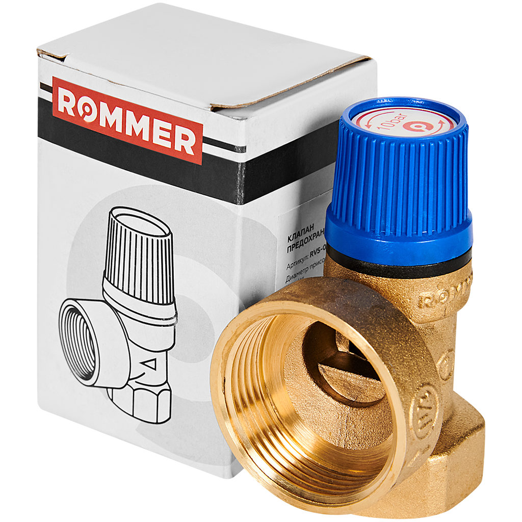Клапан ROMMER представляет собой совмещенную конструкцию из обратного и предохранительного клапана. Давление срабатывания - 10 бар. Модель оснащена ручным сбросом воды.