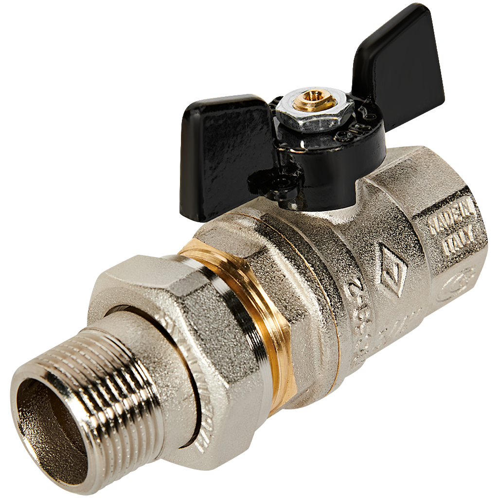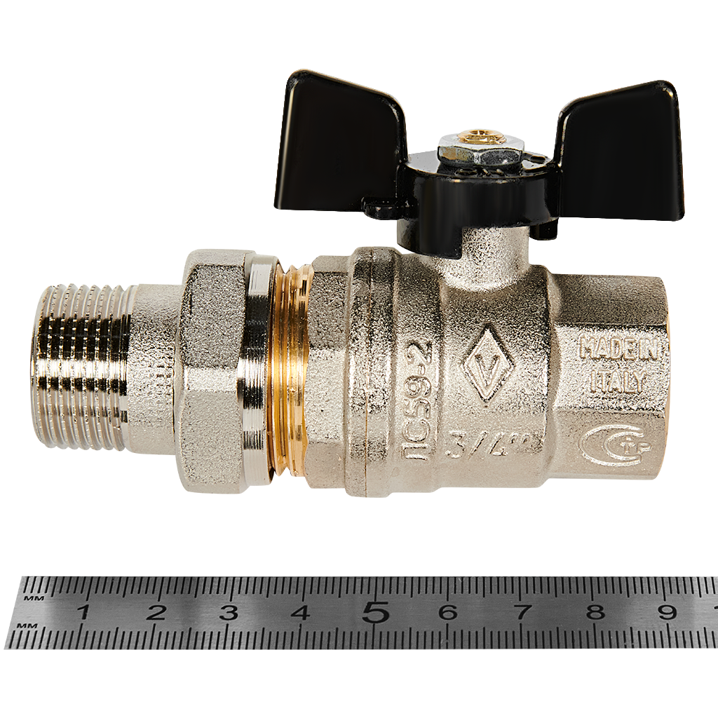Кран шаровой НВ с разъемным соединением OREGON бабочка BUGATTI 3/4" предназначен для быстрого и многократного перекрытия потока в системах домашнего водоснабжения, отопления, сжатого воздуха и установок кондиционирования. Областью применения крана шарового НВ с разъемным соединением OREGON бабочка BUGATTI 3/4" являются неагрессивные жидкости и сжатый воздух, рабочая температура составляет от -20 до +120 градусов по Цельсию, рабочее давление до 40 бар. Материал крана шарового НВ с разъемным соединением OREGON бабочка BUGATTI 3/4": корпус и шар сделаны из латуни CW617N, шток из латуни CW614N, уплотнение сферы - тефлон, рукоятка крана из алюминия.